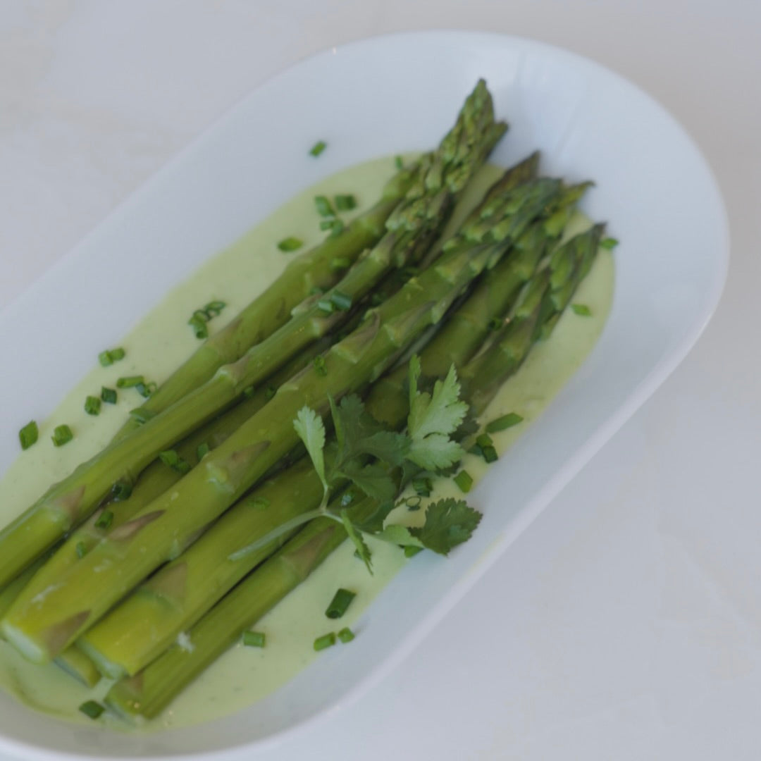 Imprimir receta¡Cremosa y llena de sabor! ¡Esta salsa holandesa de aguacate no necesita huevo! Úsala sobre tus verduras al vapor favoritas, como salsa para tu próxima carne o huevos Benedict, ¡va con todo! Aquí la presentamos con espárragos al vapor, uno de nuestros platos favoritos de la familia. Puedes sustituir el cilantro por cualquier hierba como albahaca, estragón, menta, eneldo o cebollino, según con qué la acompañes. Puedes guardar la salsa en un frasco hermético durante 4-5 días en el refrigerador.