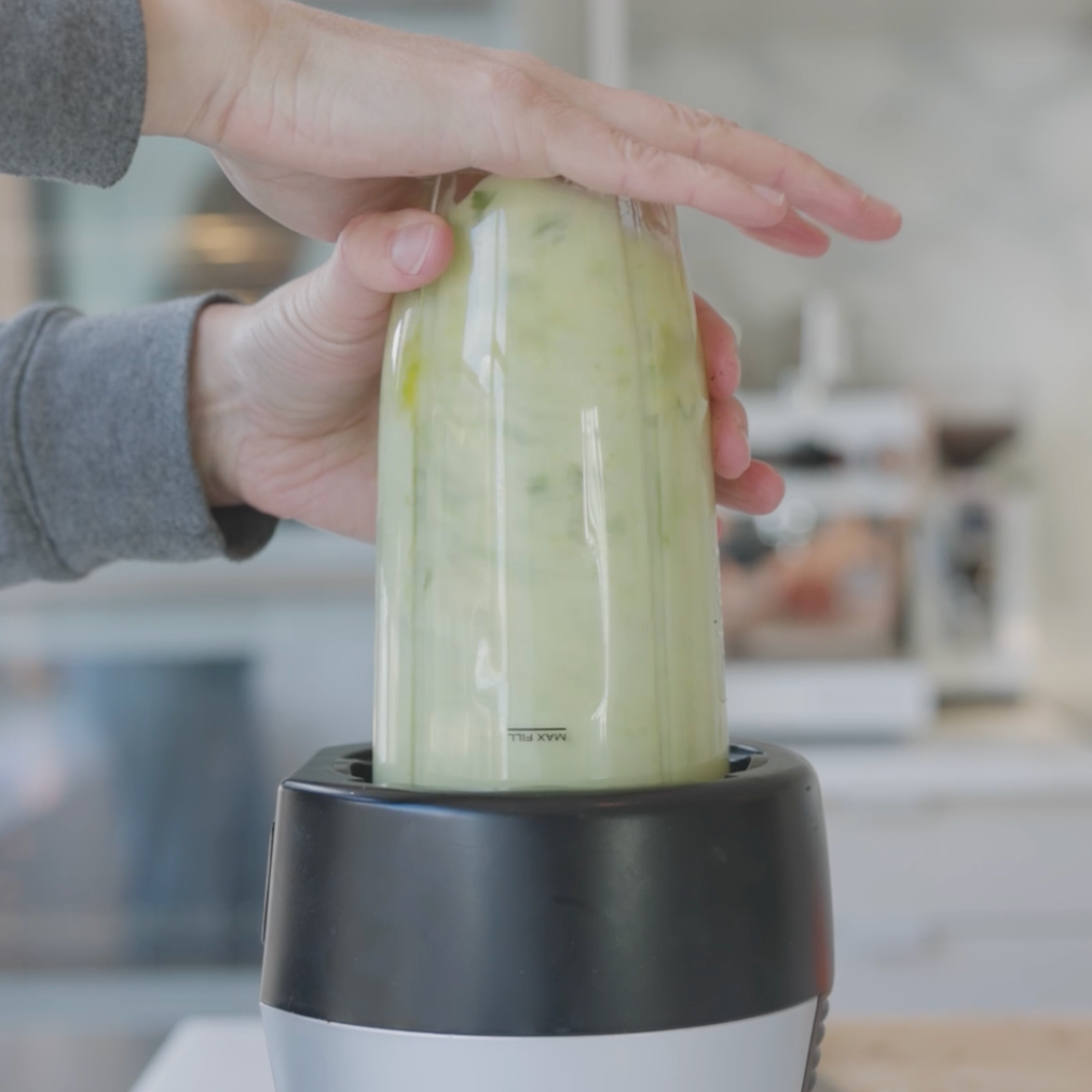 Licúa a velocidad media hasta obtener una mezcla cremosa. Si la salsa queda demasiado espesa, añade un poco más de agua para alcanzar la consistencia deseada.