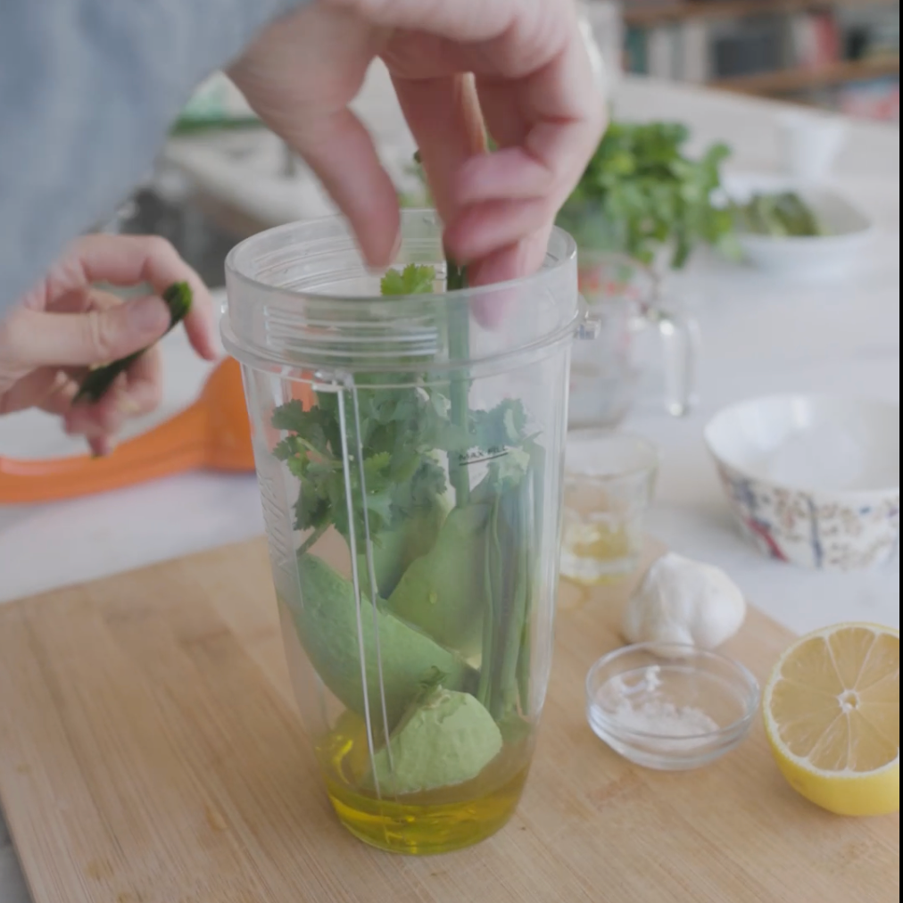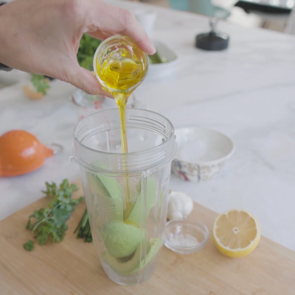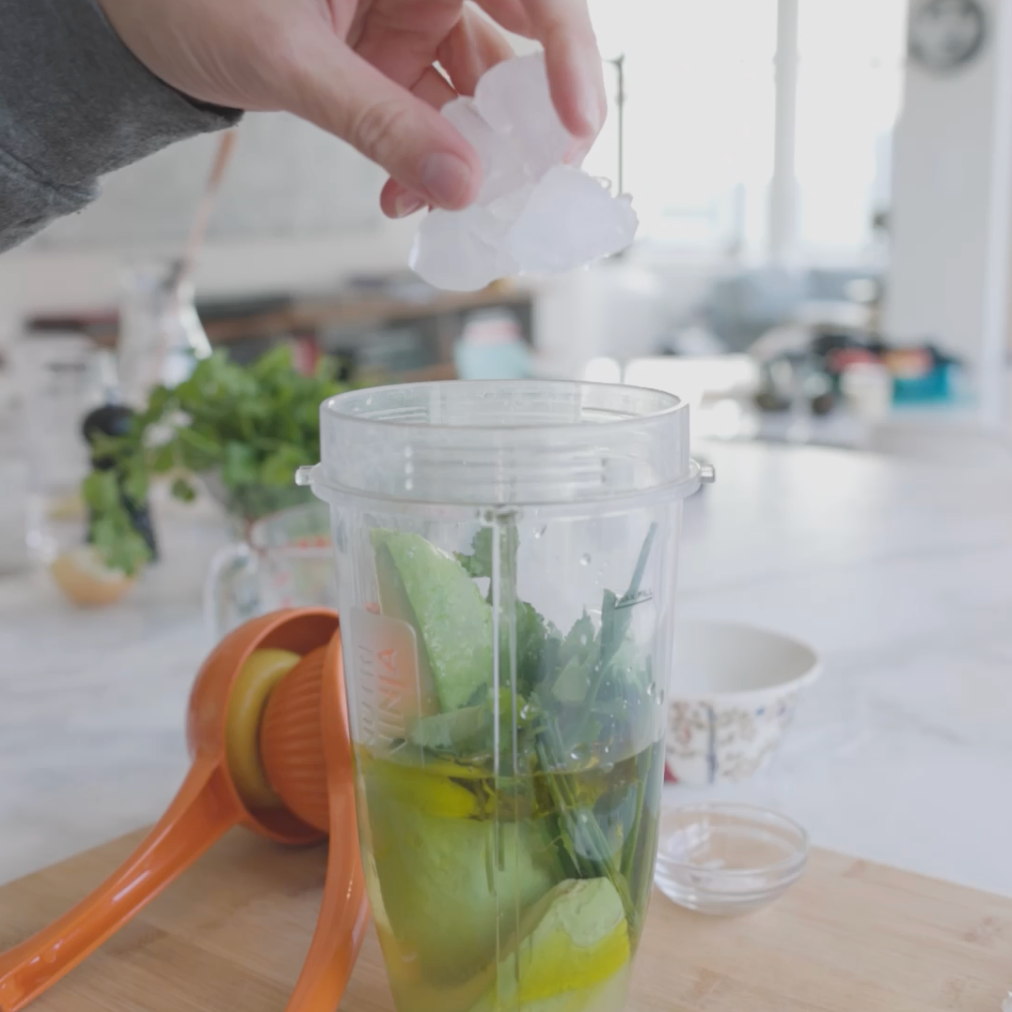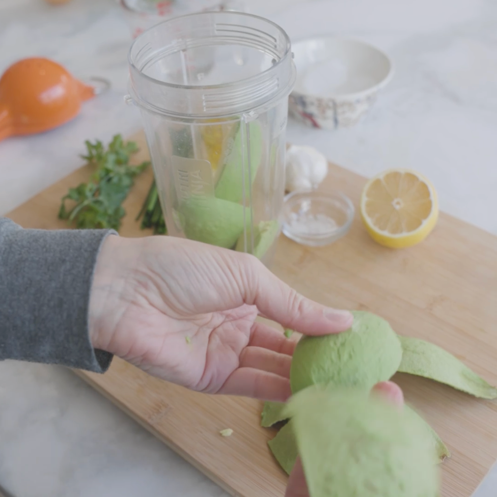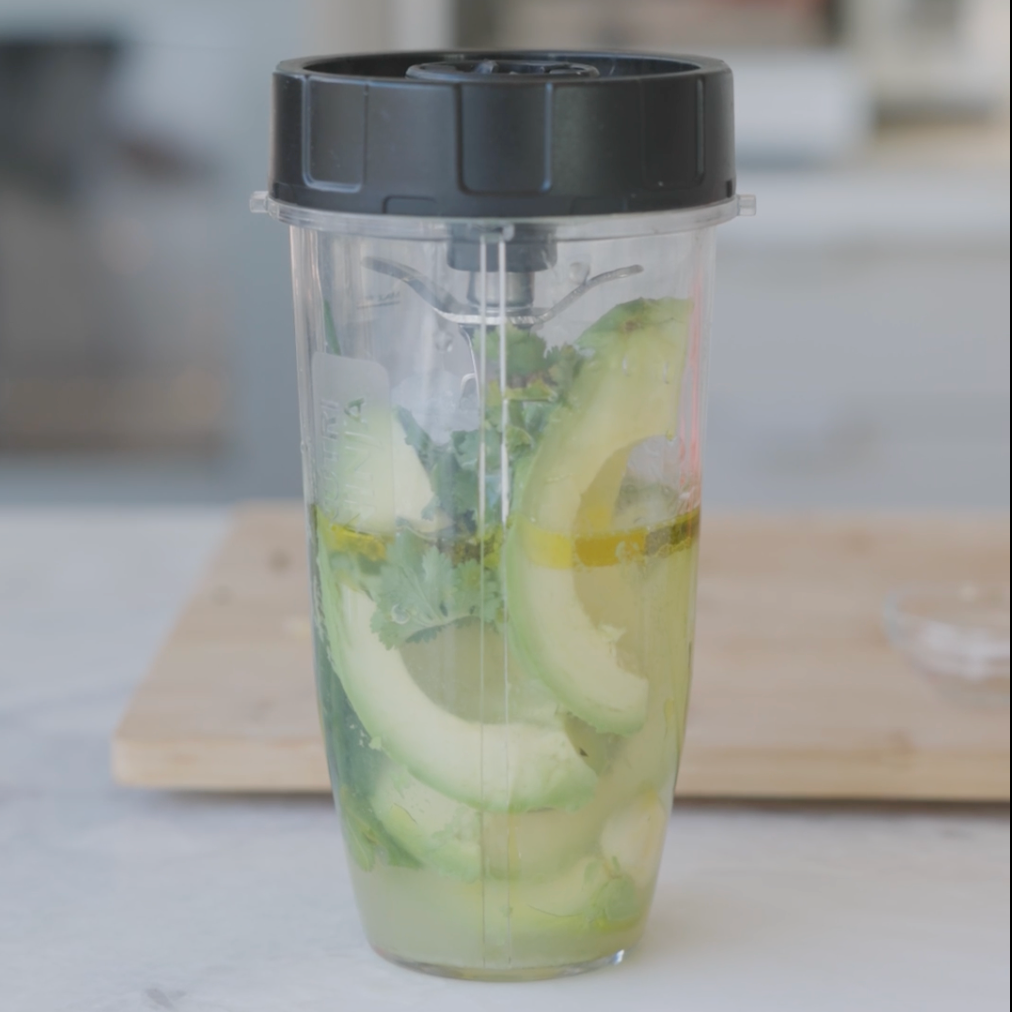 Combine el aguacate, el hielo, el agua, el aceite de oliva, el jugo de limón, las hierbas, el ajo, la sal y en una licuadora.