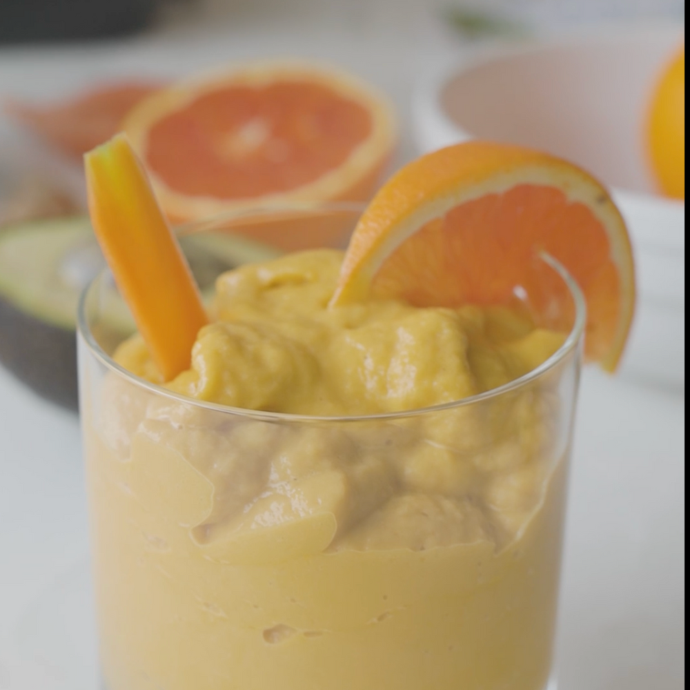 Add chopped carrots, ginger, avocado, oranges (or orange juice), and ice into a high-speed blender.