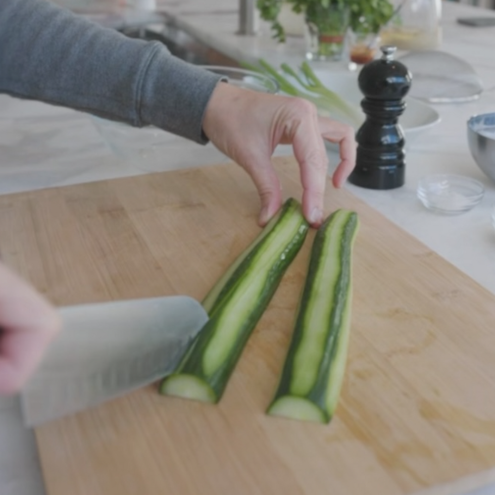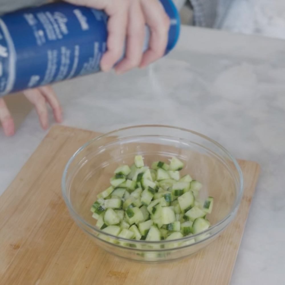 Pela el pepino. Córtalo a lo largo por la mitad y quítale las semillas. Córtalo en trozos de media pulgada. Reserva en un bol. Añade 1 cucharadita de sal y revuelve los pepinos hasta que estén cubiertos de sal de manera uniforme. Deja que el pepino "sude" durante 5 minutos.